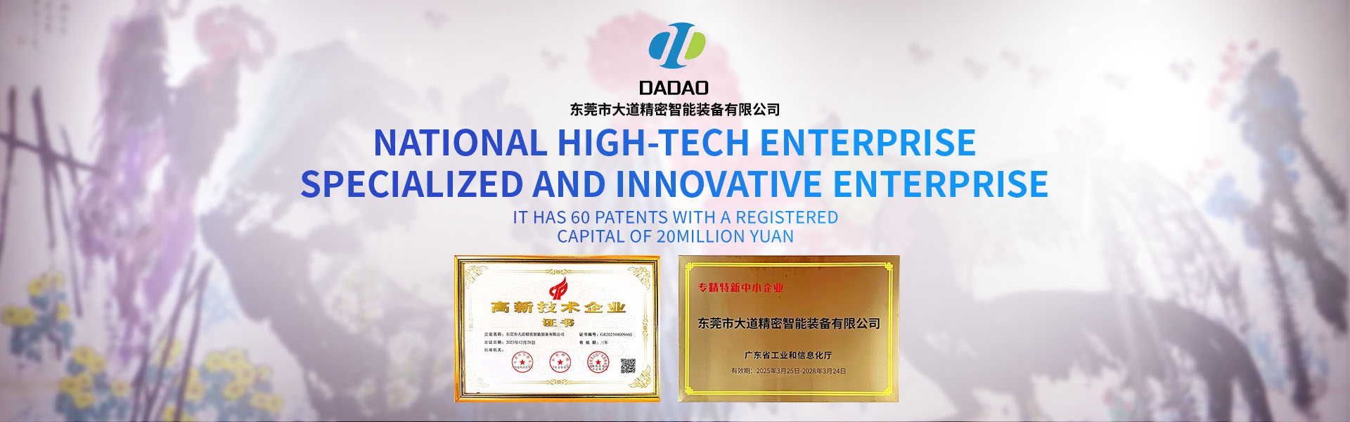 大道精密成立于2019年,公司注冊資本1000萬元,擁有辦公室、廠房等18,000多平方米。已通過ISO9001:2015國際質量管理體系認證,擁有國家各類專利共計58項,獲得“中國大道.商標”和“一帶一路十周年 .國禮品牌”等榮譽稱號,屬于國家高新技術企業(yè),專精特新中小企業(yè)。2023年4月成立了“東莞市大道精密智能裝備有限公司關心下一代工作委員會”,是東莞市企石鎮(zhèn)工商聯(lián)副會長單位、東莞市企石鎮(zhèn)文學藝術界聯(lián)合會副主席單位、東莞市環(huán)保包裝行業(yè)協(xié)會副會長單位、東莞市數(shù)控裝備行業(yè)協(xié)會第二屆會長單位、廣東省包裝技術協(xié)會常務理事單位、廣東省膠粘劑行業(yè)協(xié)會理事單位、國家標準《機械安全中安全防護授權系統(tǒng)的基本要求》起草單位。